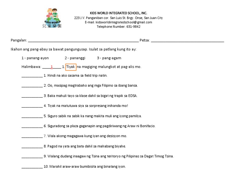 Each worksheet asks the student to underline the pang-abay word or phrase and to circle the pandiwa verb that it modifies or qualifies. Worksheets are Pagsasanay sa filipino Pagsasanay sa filipino Kundisyunal na pang abay work Pang abay na pamaraan1 Gamit ang pang abay Fernandez pre school Halimbawa ng talata gamit ang pang uri Panitikang asyano ng mag aaral sa filipino draft. Nagsasaad kung kailan ginanap ang kilos.