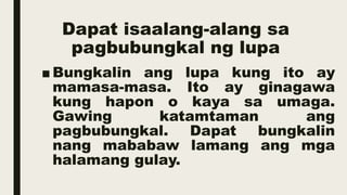 PANGANGALAGA SA MGA YAMANG LUPA 4. Naririto ang ilang paraan upang matiyak ang maunlad at masaganang ani. Sinag ng araw hangin tubig na pandilig lupa pataba sa lupa o abono.