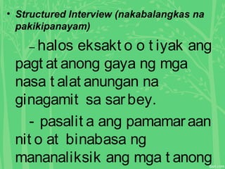 Sapat na ang pagkuha ng porsyento o bahagdan matapoos mai-tally ang mga kasagutan sa kwestyoneyr ng mga respondente. APPLIED RESEARCH Gumagamit ng. Maingat na isinasagawa proseso at dumadaan sa mga hakbang ng pagtatanong at pagtugon at malalimang pagsuri sa.