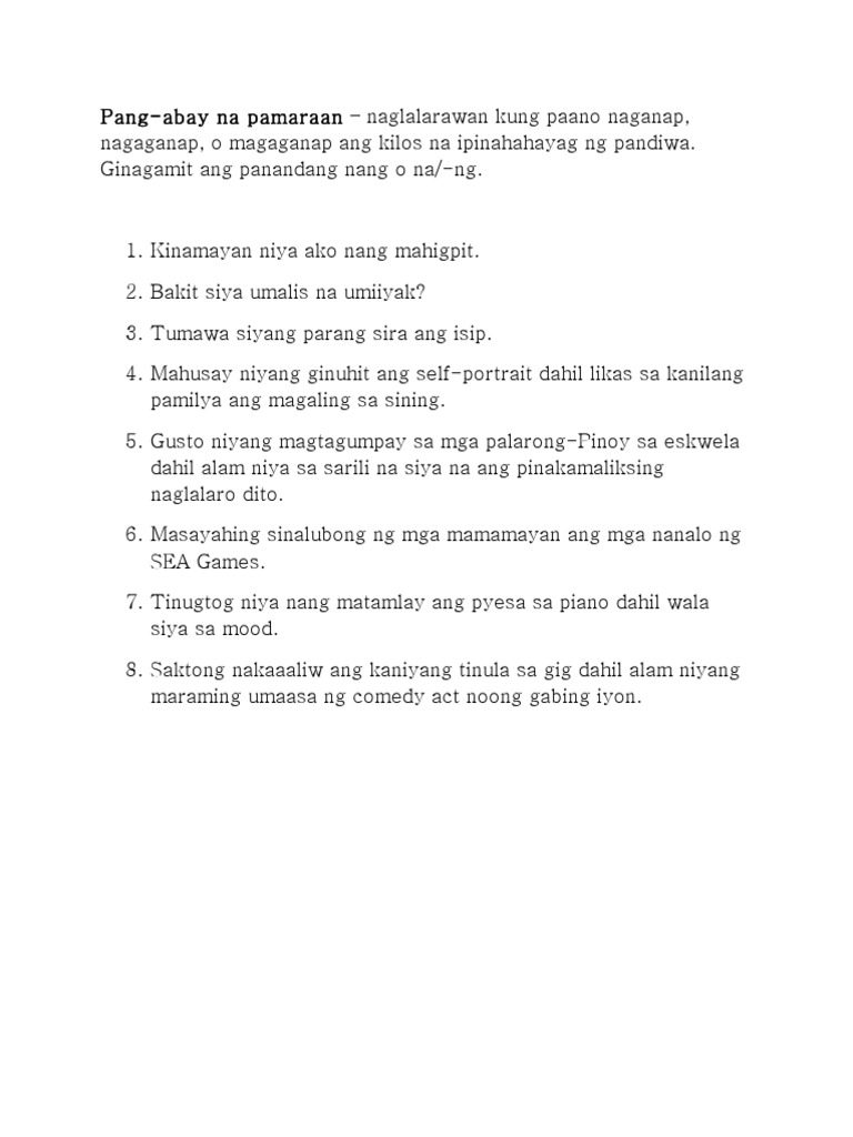 Some of the worksheets for this concept are Pang abay na pamaraan1 Pagsasanay sa filipino Pagtukoy sa pang abay na panlunan 1 Pagsasanay sa filipino Pinag ayaw ayaw na gawain sa filipino baitang walo taong Talata. Click on Open button to open and print to worksheet.